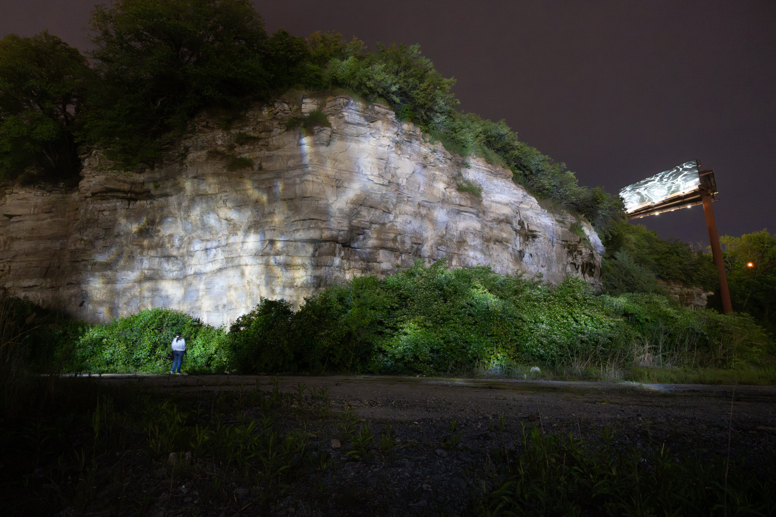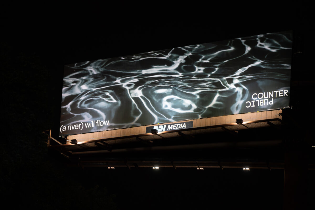 For Counterpublic 2023, X imagines the shape of the land before and after human intervention. The bluffs atop which Jefferson Avenue is built were carved by river from stone over millennia. Today, the bluffs are a site of industry that misunderstands the one-to-one relationship between human longevity and the earth’s durability. His light and sound installation, (a river) will flow, returns the industrialized area along the Mississippi River below Jefferson Avenue to the shape of the river’s design and rescales viewers as one part of a larger ecosystem—with the potential to intervene in the river’s future through acts of unbuilding and reimagining what mutuality with the land could be.
