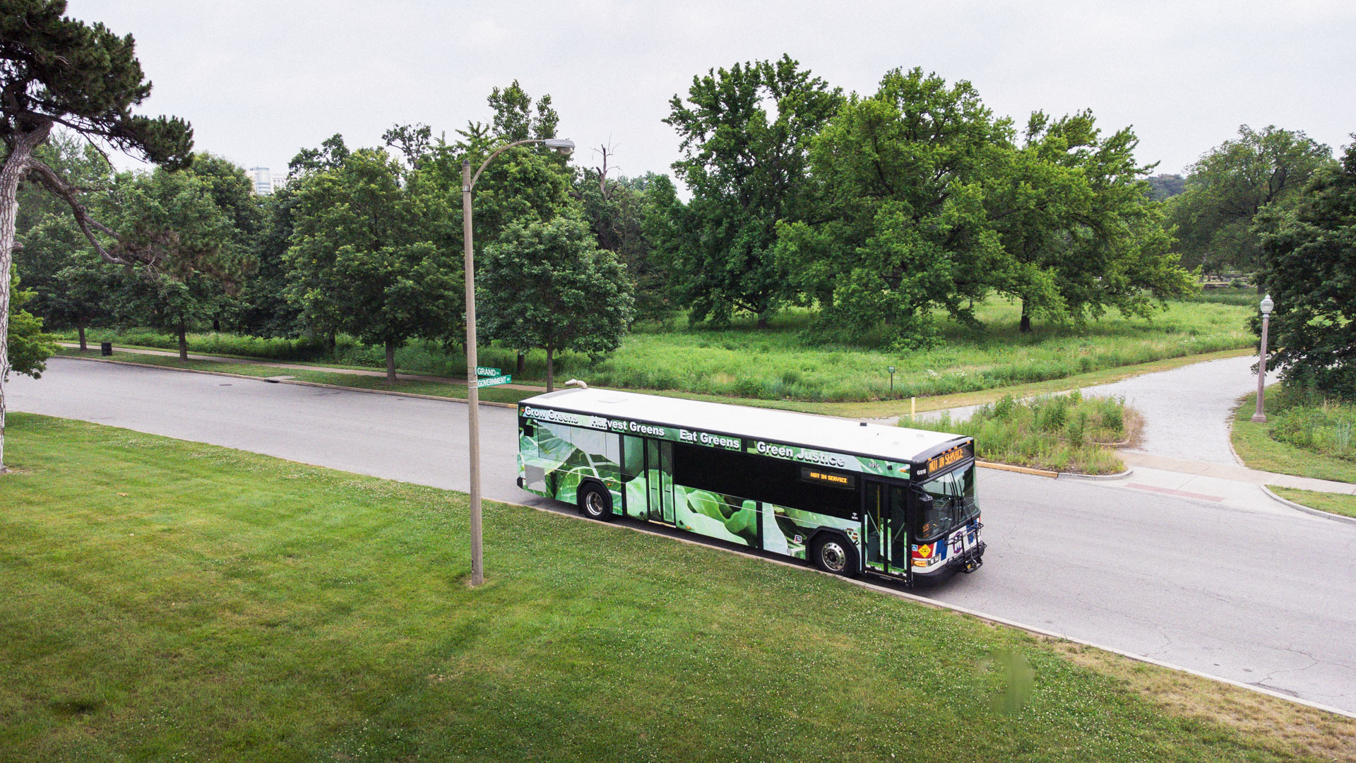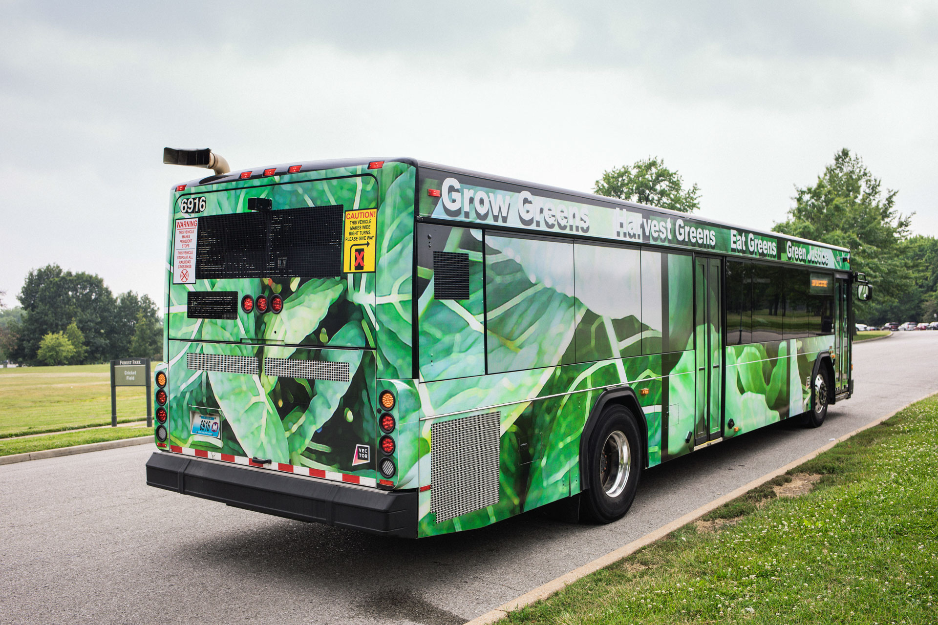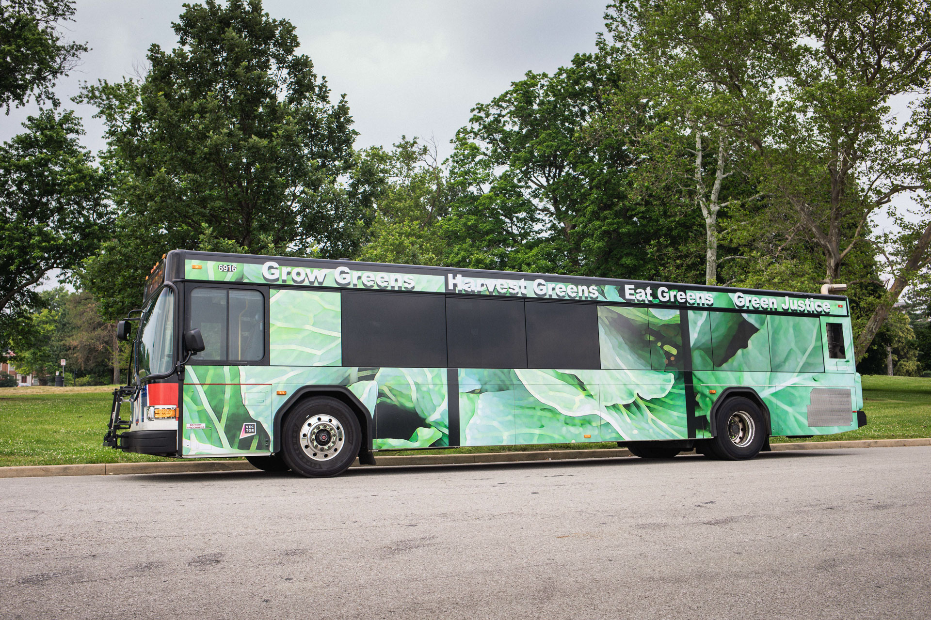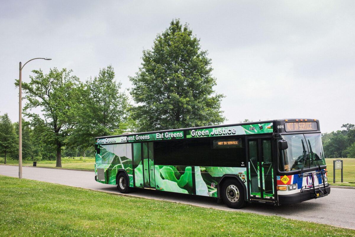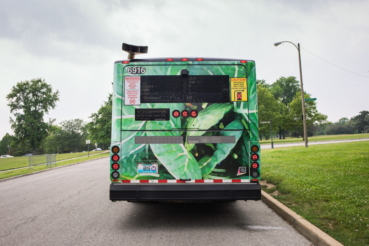 The project had roots in the artist’s aunt’s garden in Meacham Park, a Black neighborhood annexed by the St. Louis suburb of Kirkwood and incrementally razed through development in the second half of the twentieth century. There, Jones’s family tended a thriving garden whose bulbs were later transplanted to Jones’s home in the Twin Cities. This return reseeded the healing greens back into a landscape marred by uprooted Black communities, from Mill Creek Valley and Pruitt-Igoe to ongoing gentrification and abandonment. Placing the collards along the bus system offers an alternate record of survivance and nourishment, a persistence of Black life and tradition stretching back centuries, and a proposition to the future health of the many communities the work will move through.