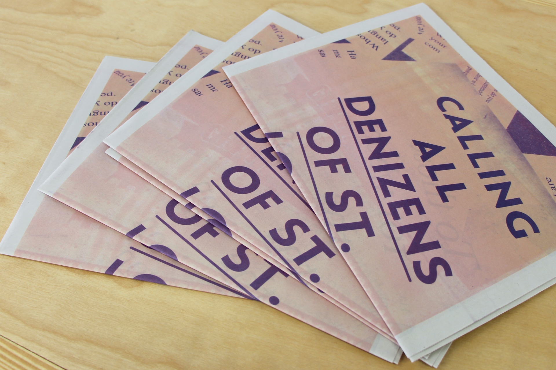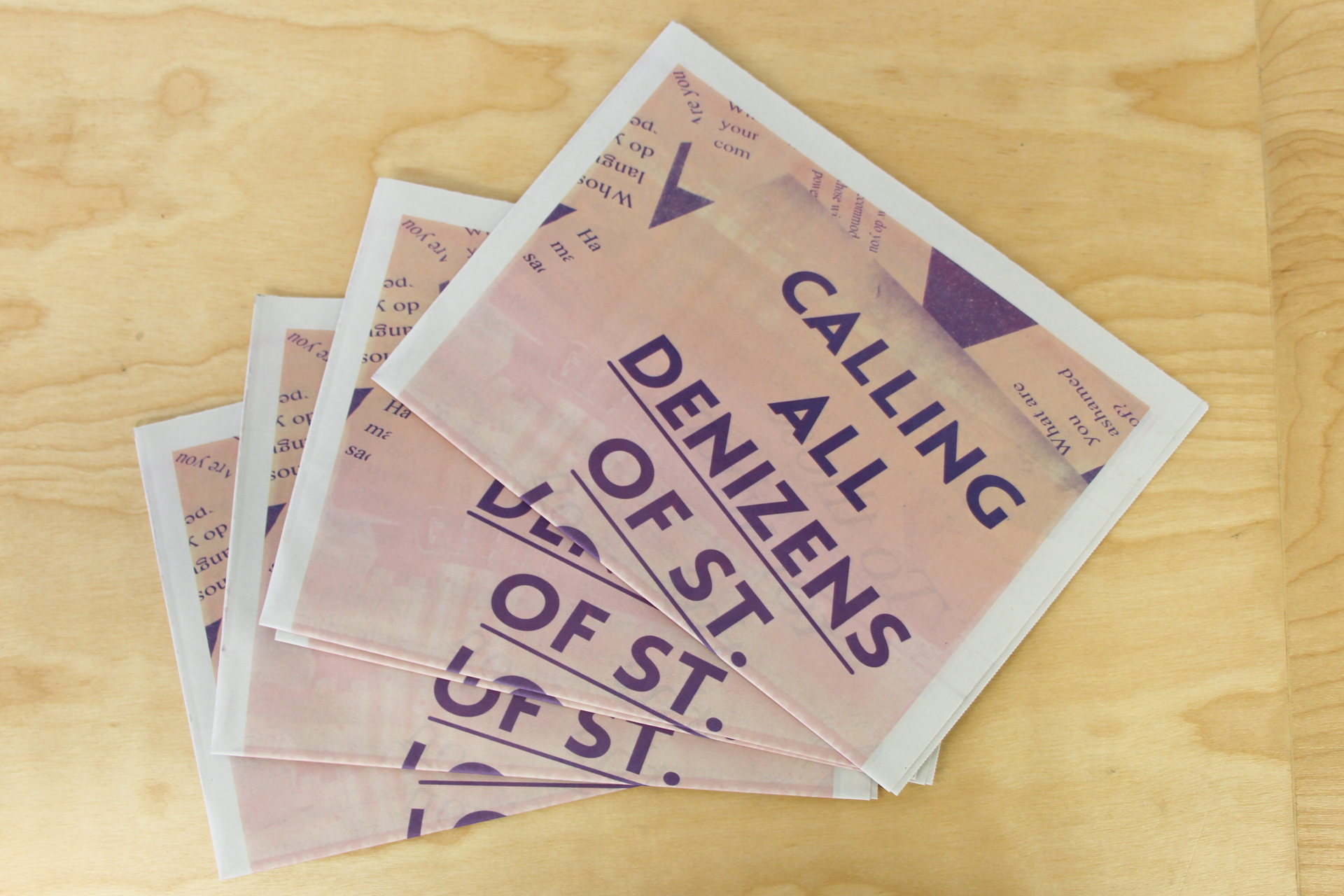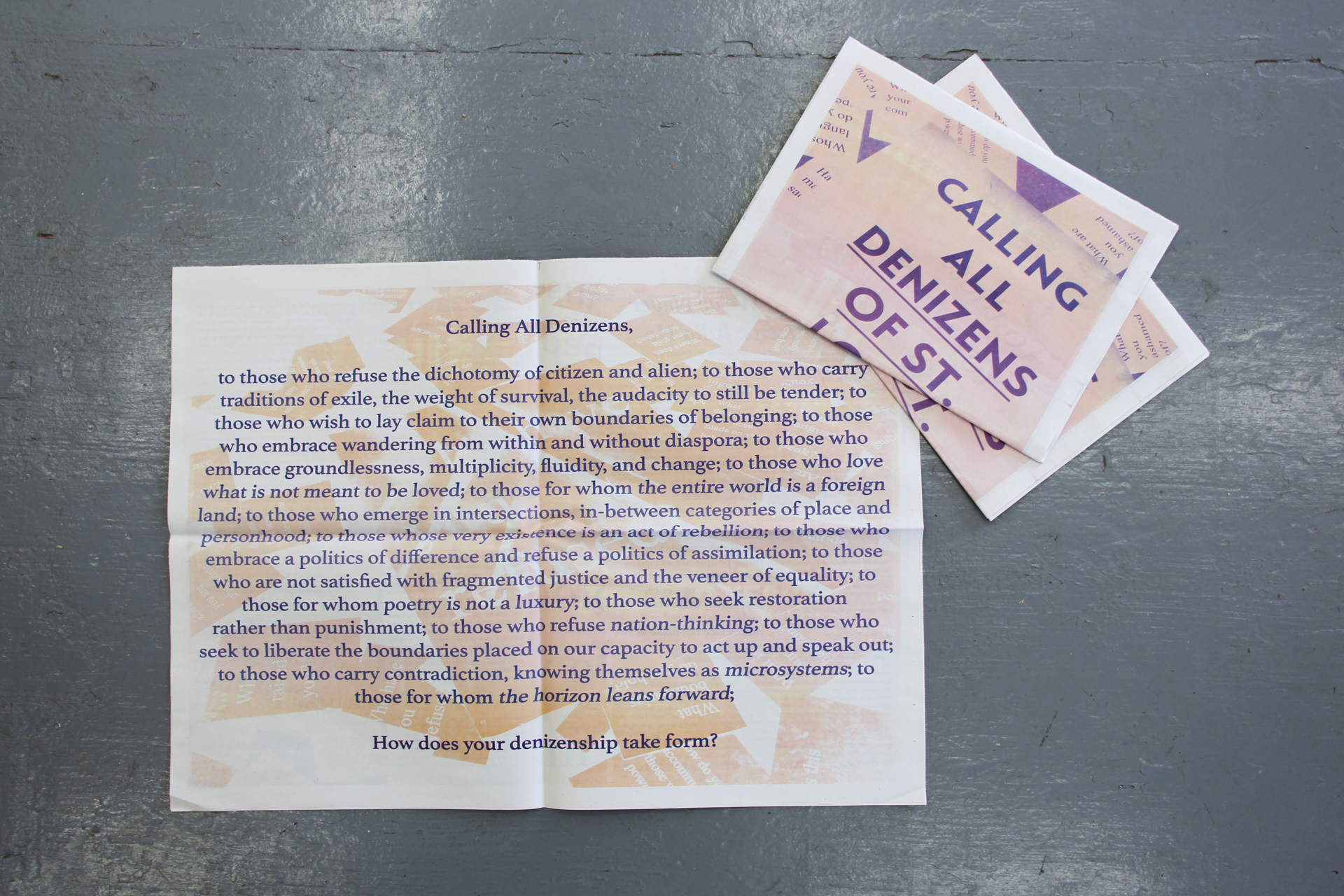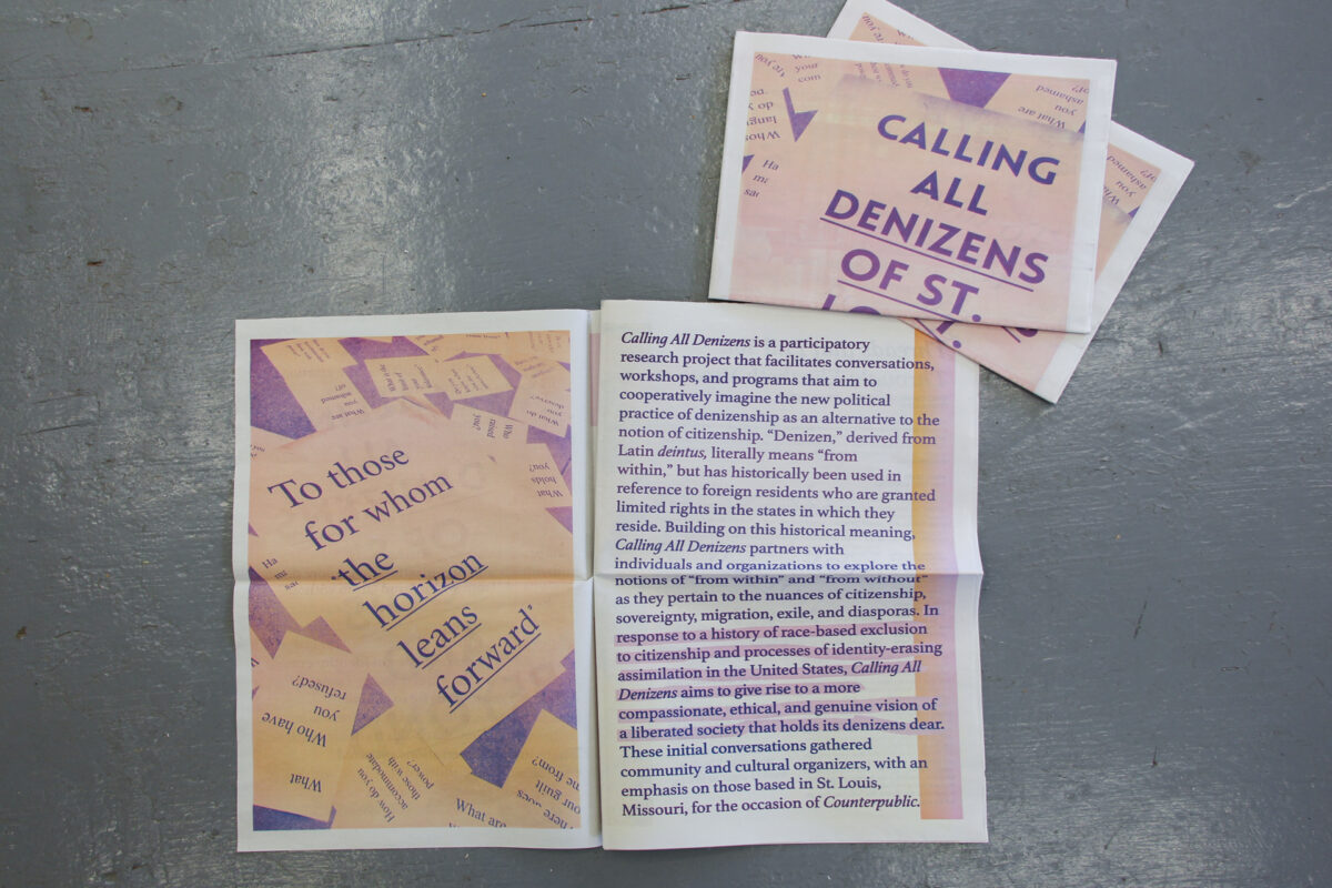 For Counterpublic, Kimi Hanauer opened a large-scale public installation and publication entitled Free From To With For to consider alternative conceptions of citizenship and statelessness. Free From To With For is a participatory research project that facilitates conversations, workshops, and programs that aim to cooperatively imagine the new political practice of denizenship as an alternative to the notion of citizenship. “Denizen” has historically been used in reference to foreign residents who are granted limited rights in the states in which they reside. Building on this historical meaning, Free From To With For partners with individuals and organizations to explore the notions of “from within” and “from without” as they pertain to the nuances of citizenship, sovereignty, migration, exile, and diasporas. In response to a history of race-based exclusion to citizenship and processes of identity-erasing assimilation in the United States, Free From To With For aims to give rise to a more compassionate, ethical, and genuine vision of a liberated society that holds its denizens dear. Visitors may find the installation and publication outdoors at 2330 Cherokee Street, with a full publication release to follow on June 8th.