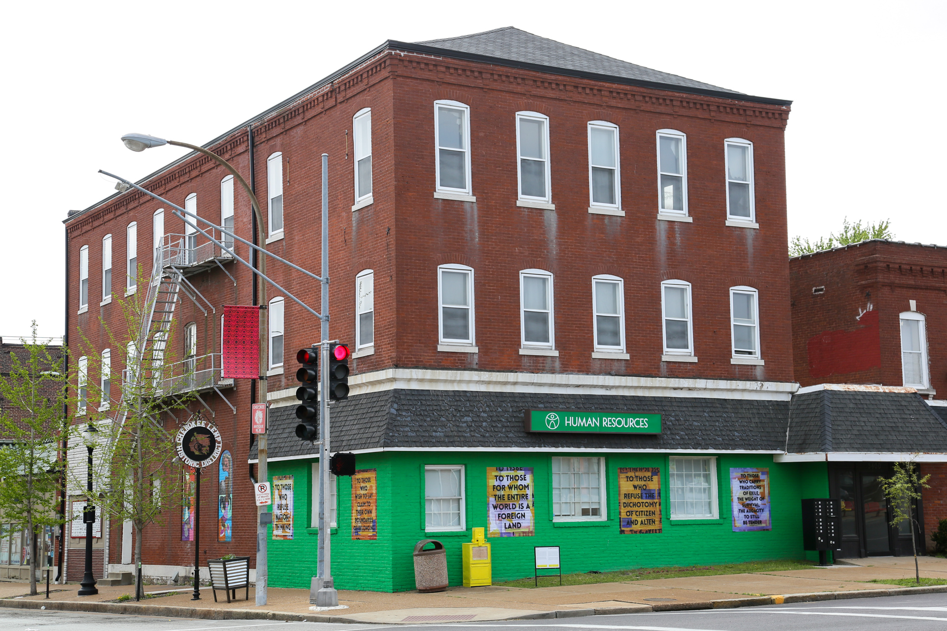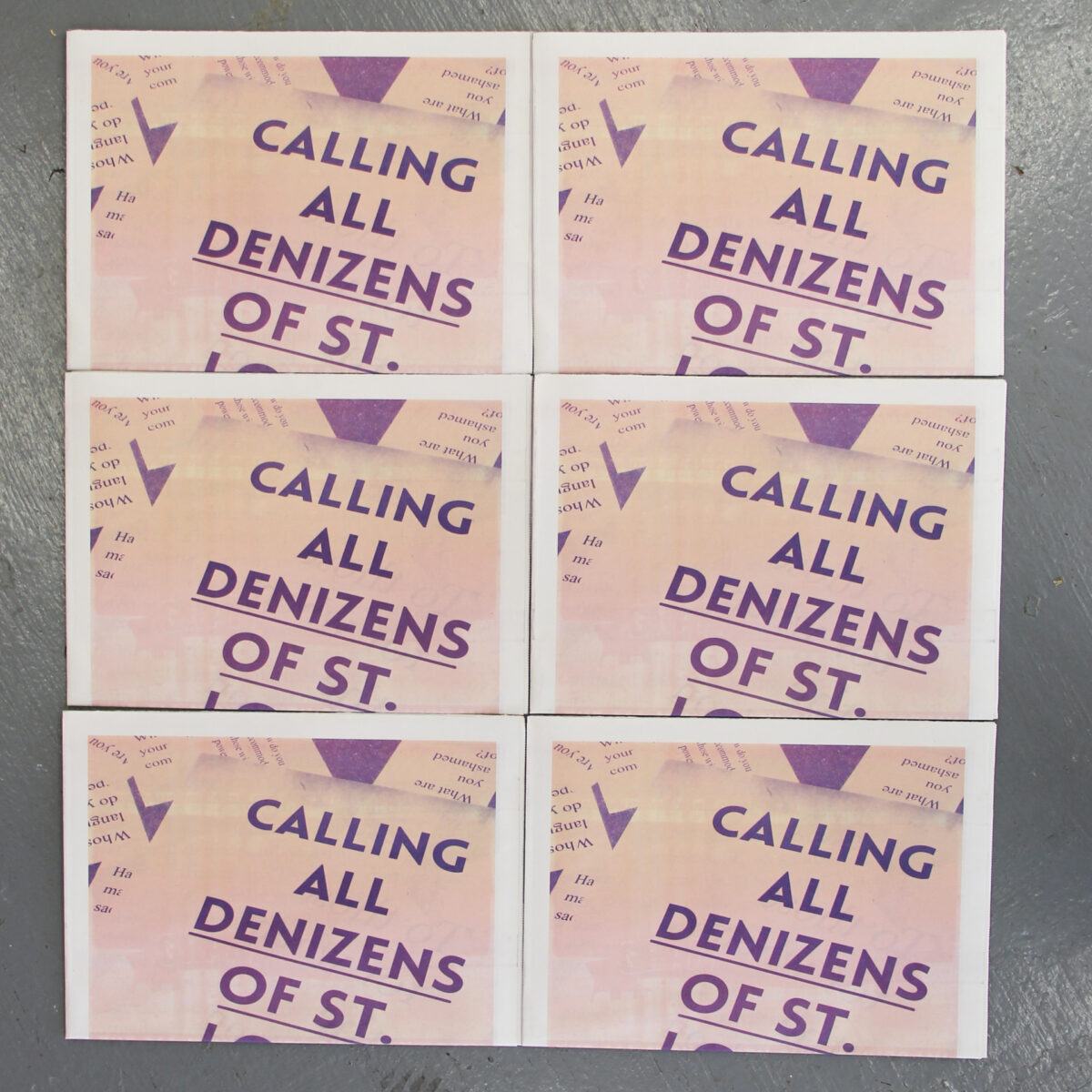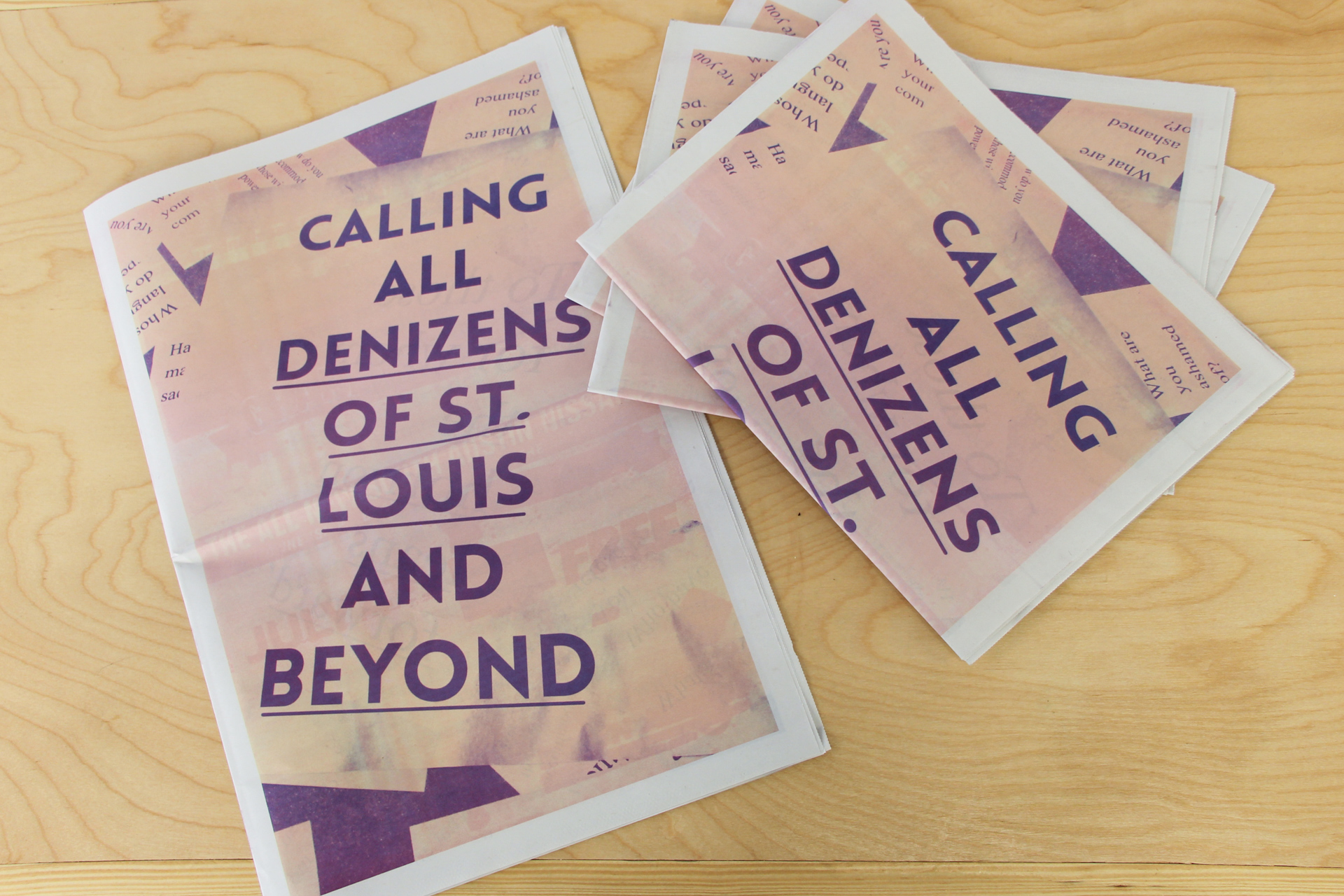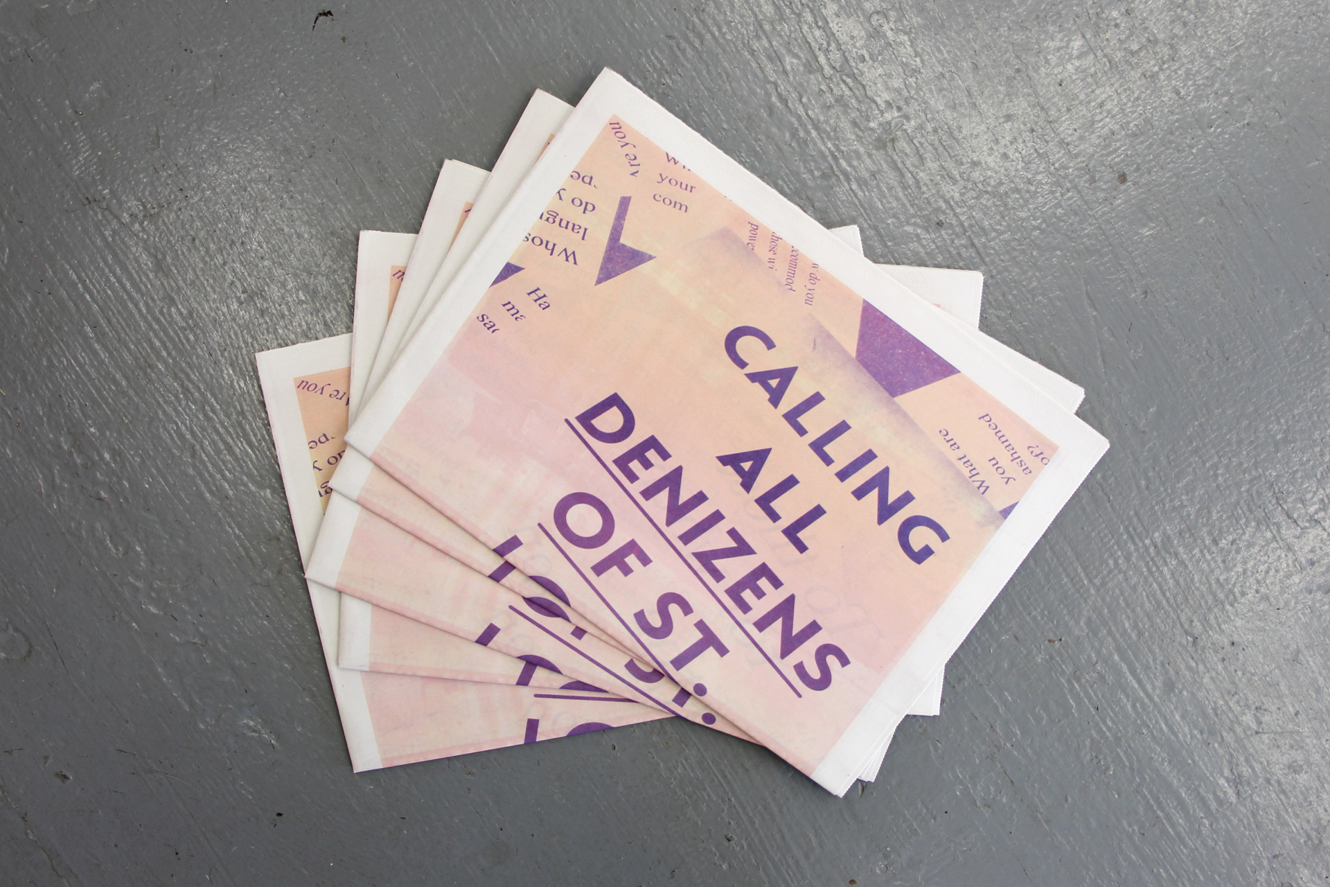 For Counterpublic, Kimi Hanauer opened a large-scale public installation and publication entitled Free From To With For to consider alternative conceptions of citizenship and statelessness. Free From To With For is a participatory research project that facilitates conversations, workshops, and programs that aim to cooperatively imagine the new political practice of denizenship as an alternative to the notion of citizenship. “Denizen” has historically been used in reference to foreign residents who are granted limited rights in the states in which they reside. Building on this historical meaning, Free From To With For partners with individuals and organizations to explore the notions of “from within” and “from without” as they pertain to the nuances of citizenship, sovereignty, migration, exile, and diasporas. In response to a history of race-based exclusion to citizenship and processes of identity-erasing assimilation in the United States, Free From To With For aims to give rise to a more compassionate, ethical, and genuine vision of a liberated society that holds its denizens dear. Visitors may find the installation and publication outdoors at 2330 Cherokee Street, with a full publication release to follow on June 8th.