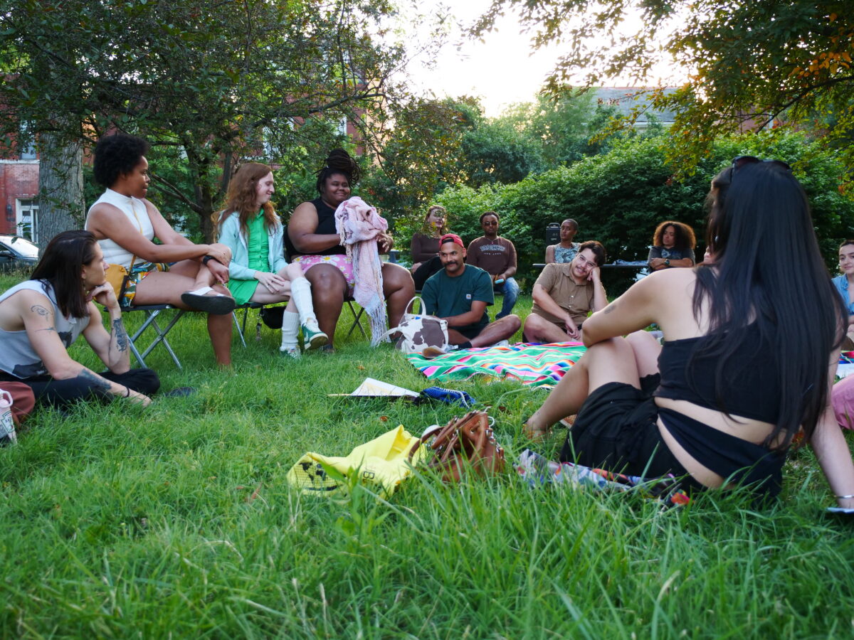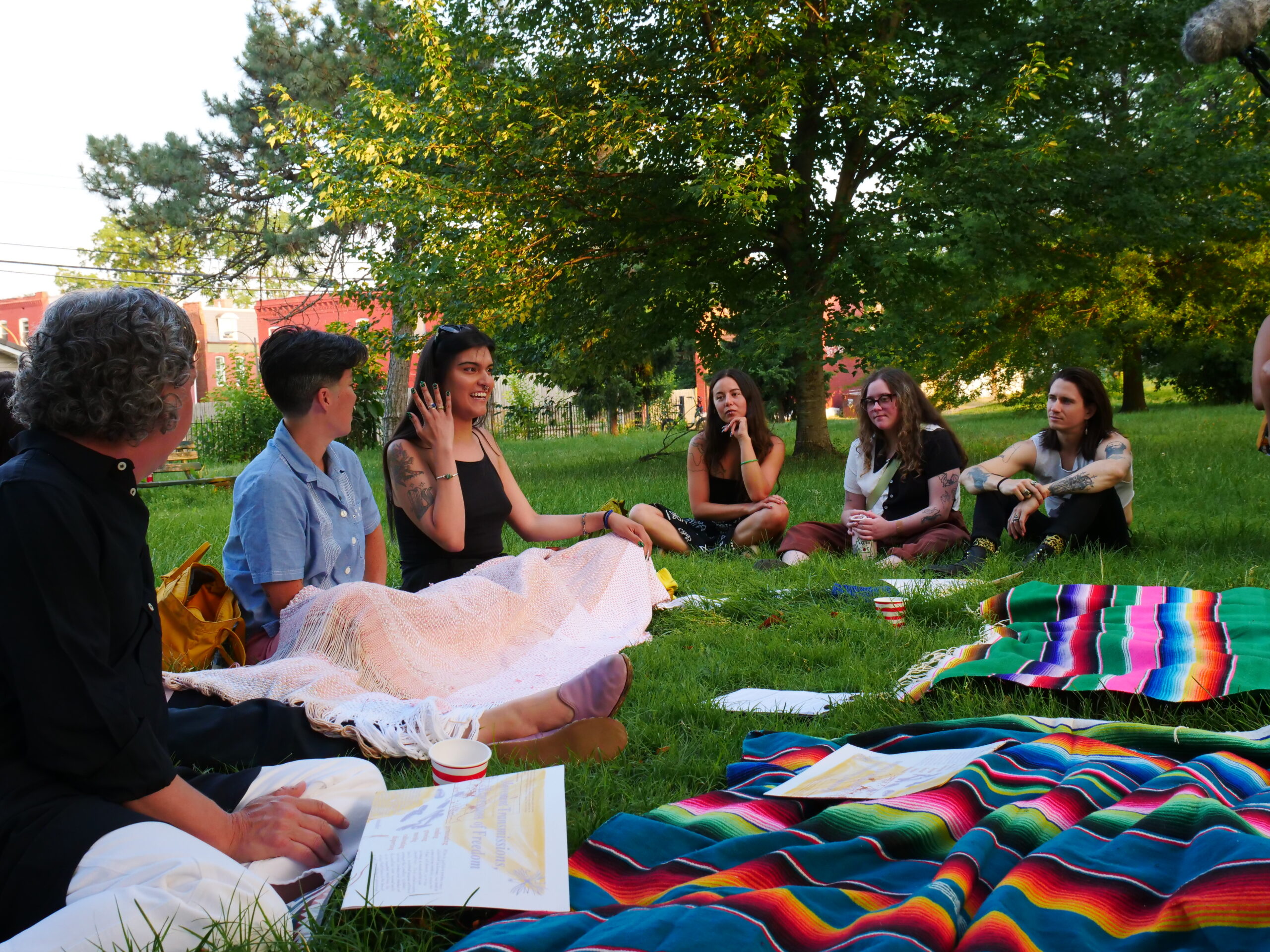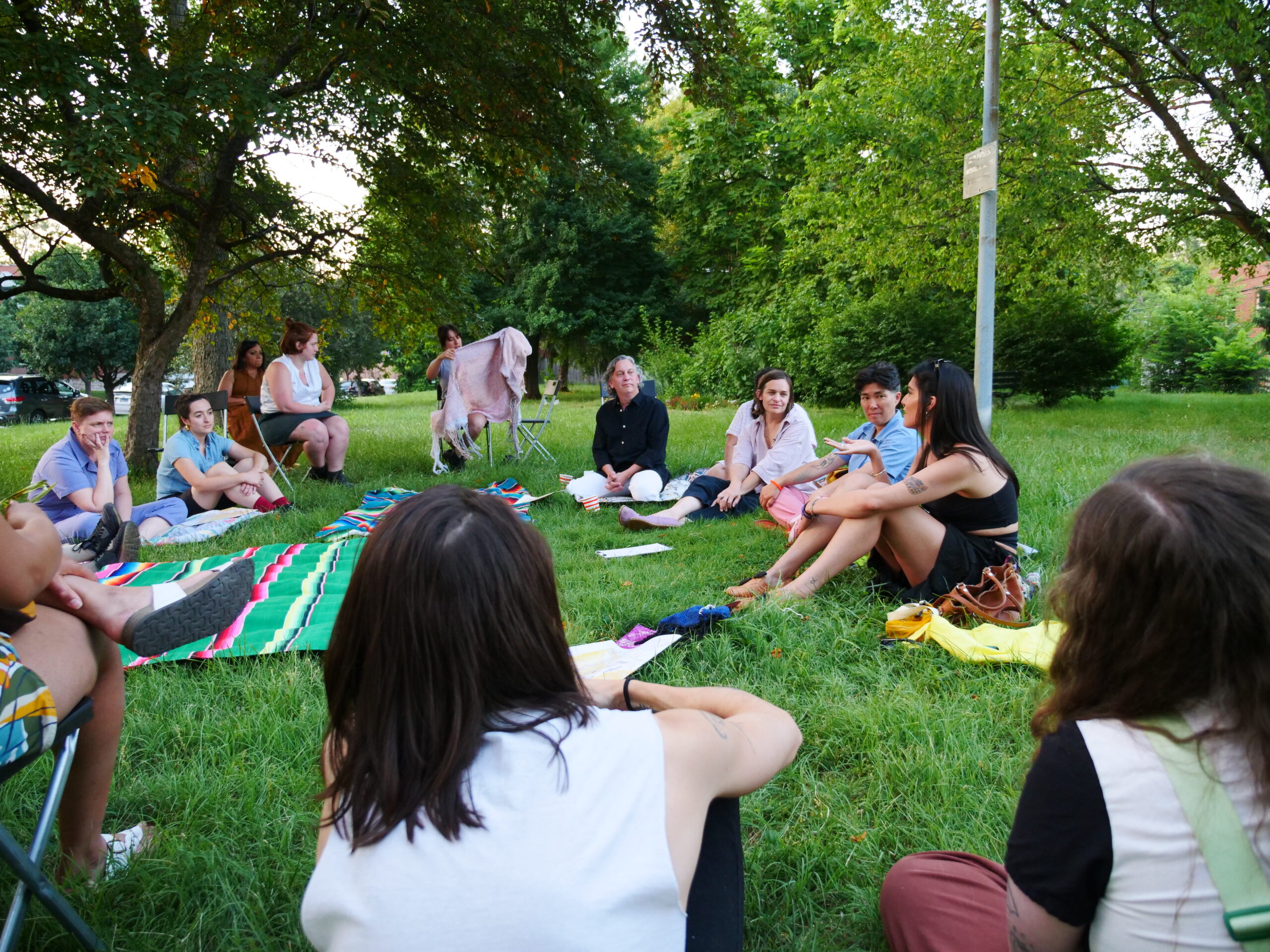 Participants gathered in Carnegie Park on a blanket with colors made from avocados and black beans, woven on a four harness loom. Attendees were invited to soften a surface and inhabit the park, asking “Where do we go to be seen?”, “Where is the scene?”, “How do we cultivate these spaces while also holding space for safety/nurturing/self-preservation/protection?”, “Are there public spaces in St. Louis that resonate or are this for you?”