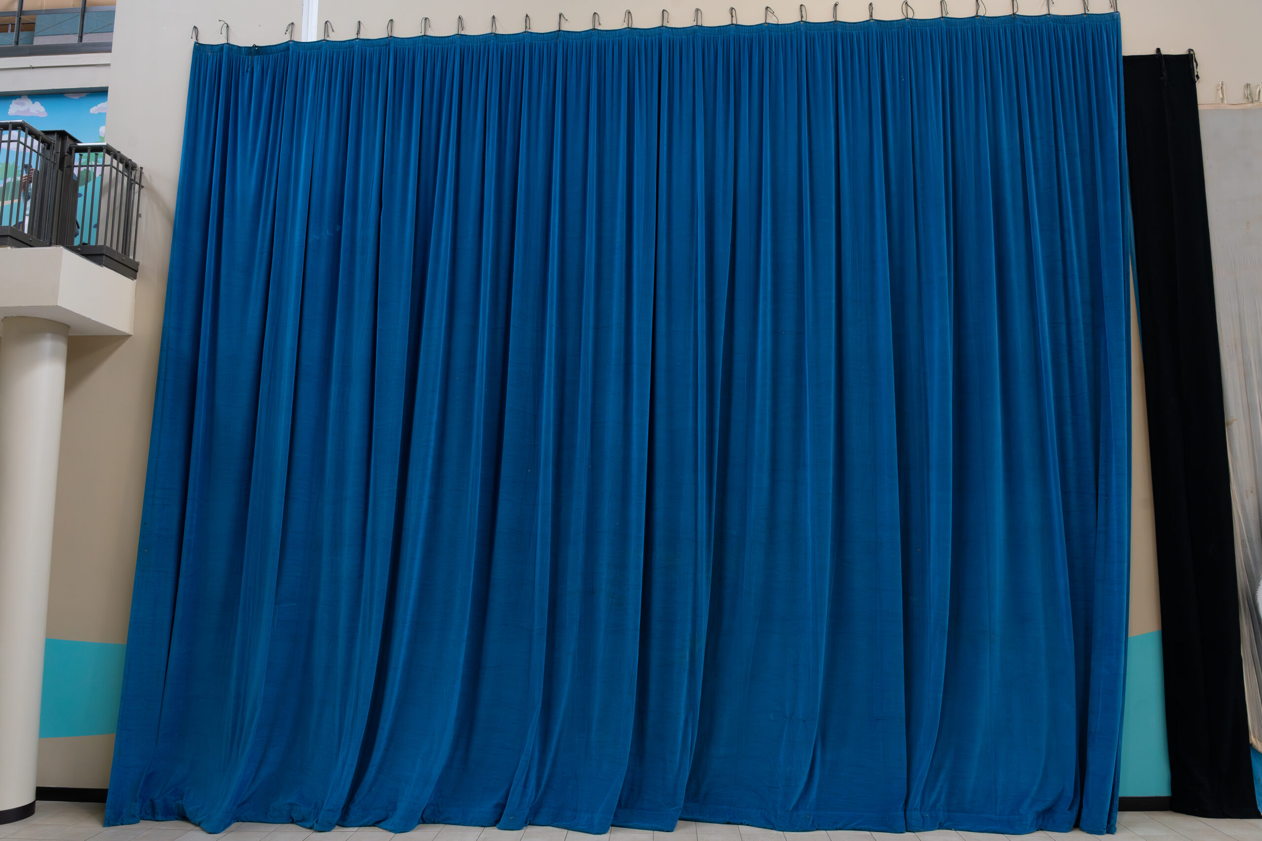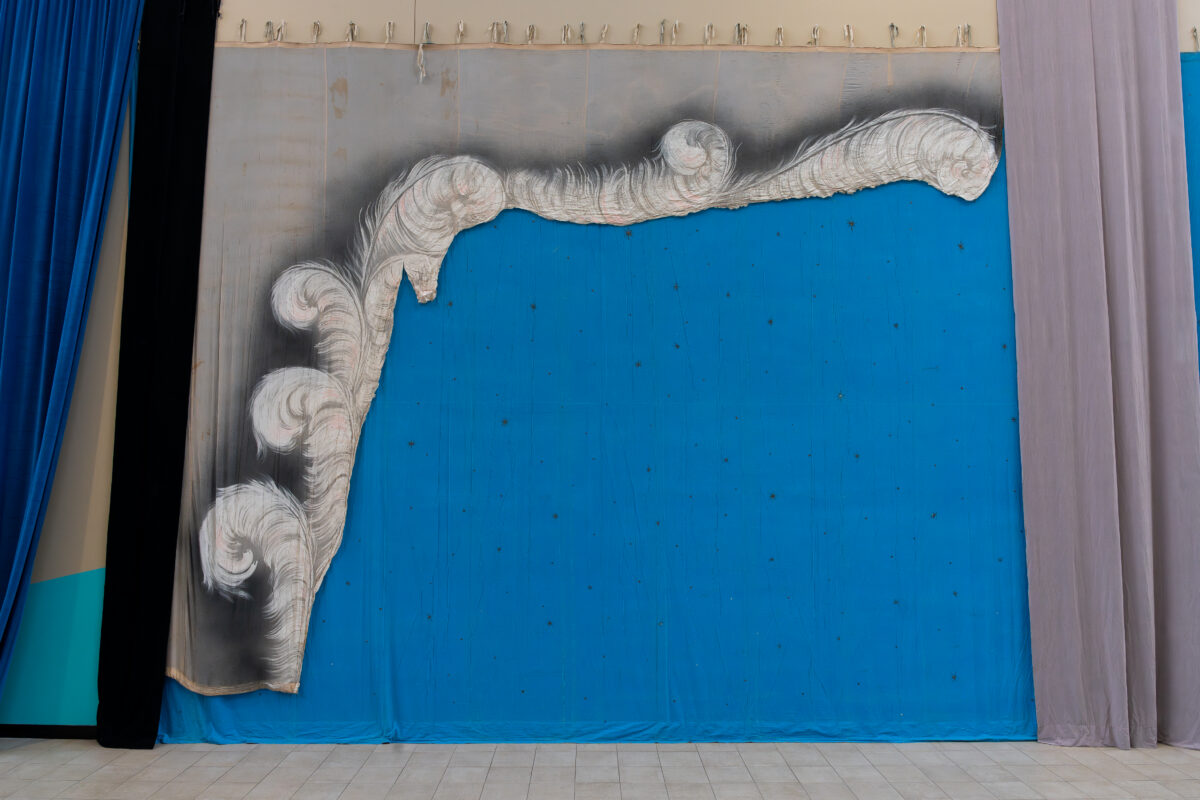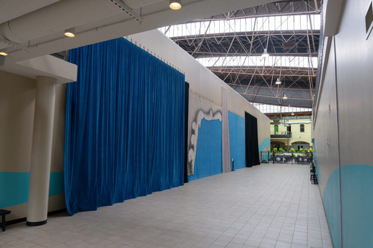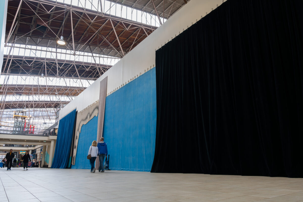 Installed in Union Station, Untitled (Ripple) was a monumental sculpture of decommissioned theater drapes and scenic canvas flats.