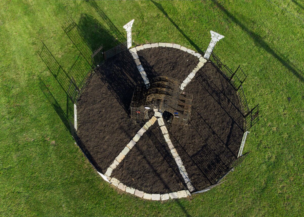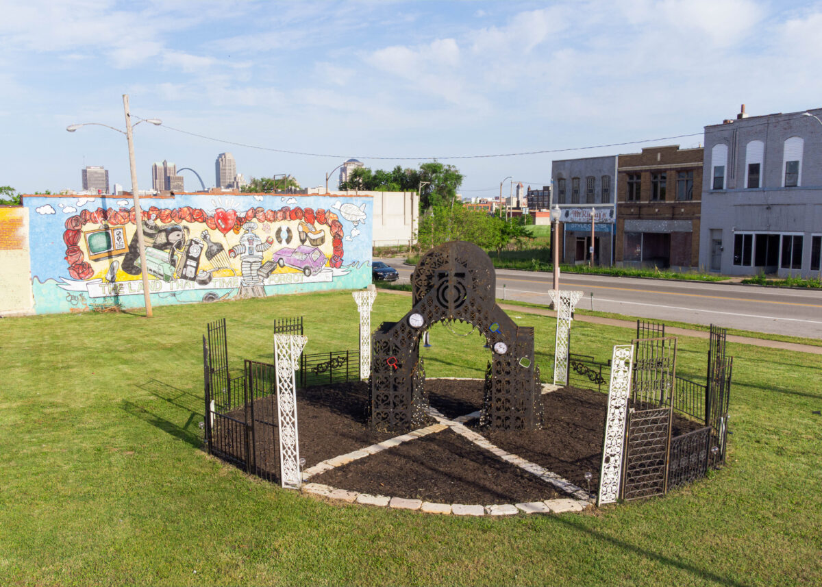 SLOWER-THAN-LIGHT SHRINE: IN REMEMBRANCE OF THE UNDERGROUND RAILROAD is a public monument and portal paying homage to liberation seekers who traversed the Underground Railroad in St. Louis, using the caves beneath the city on their path. The shrine honors the abolitionist movement and marronage of the Underground Railroad, and the resonance of the issues urgent in the present and relative future(s). The shrine is constructed in the image of a Kongo cosmogram as well as configurations related to quantum physics experiments with gates and archways drawn from demolished homes in St. Louis.