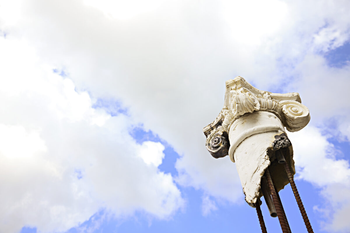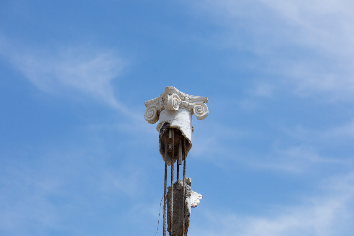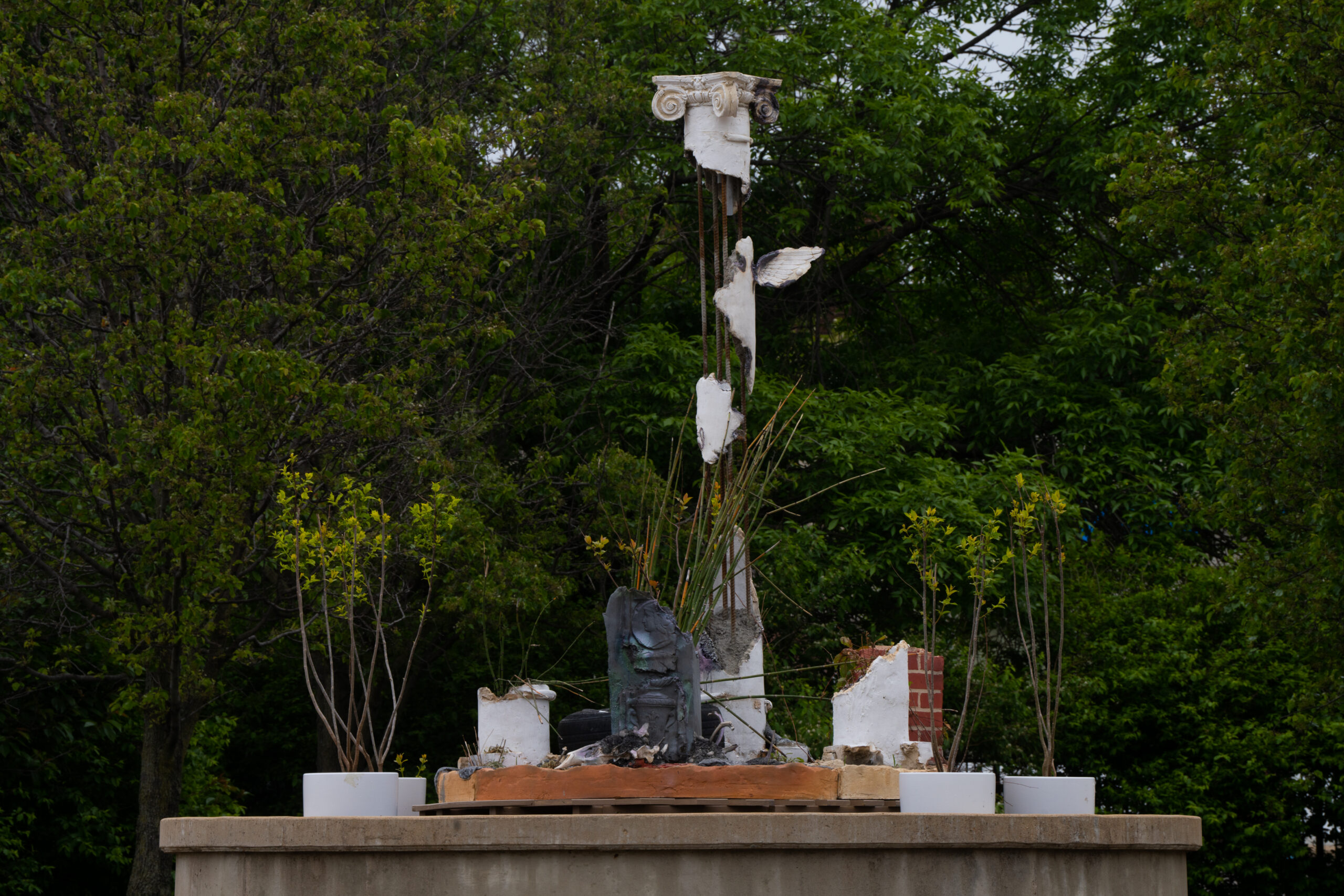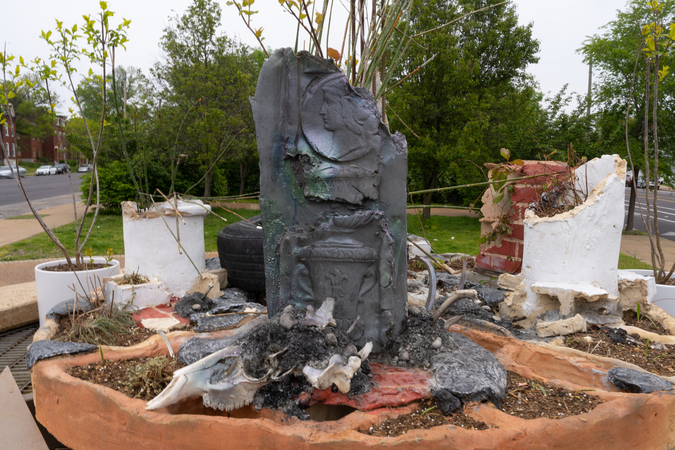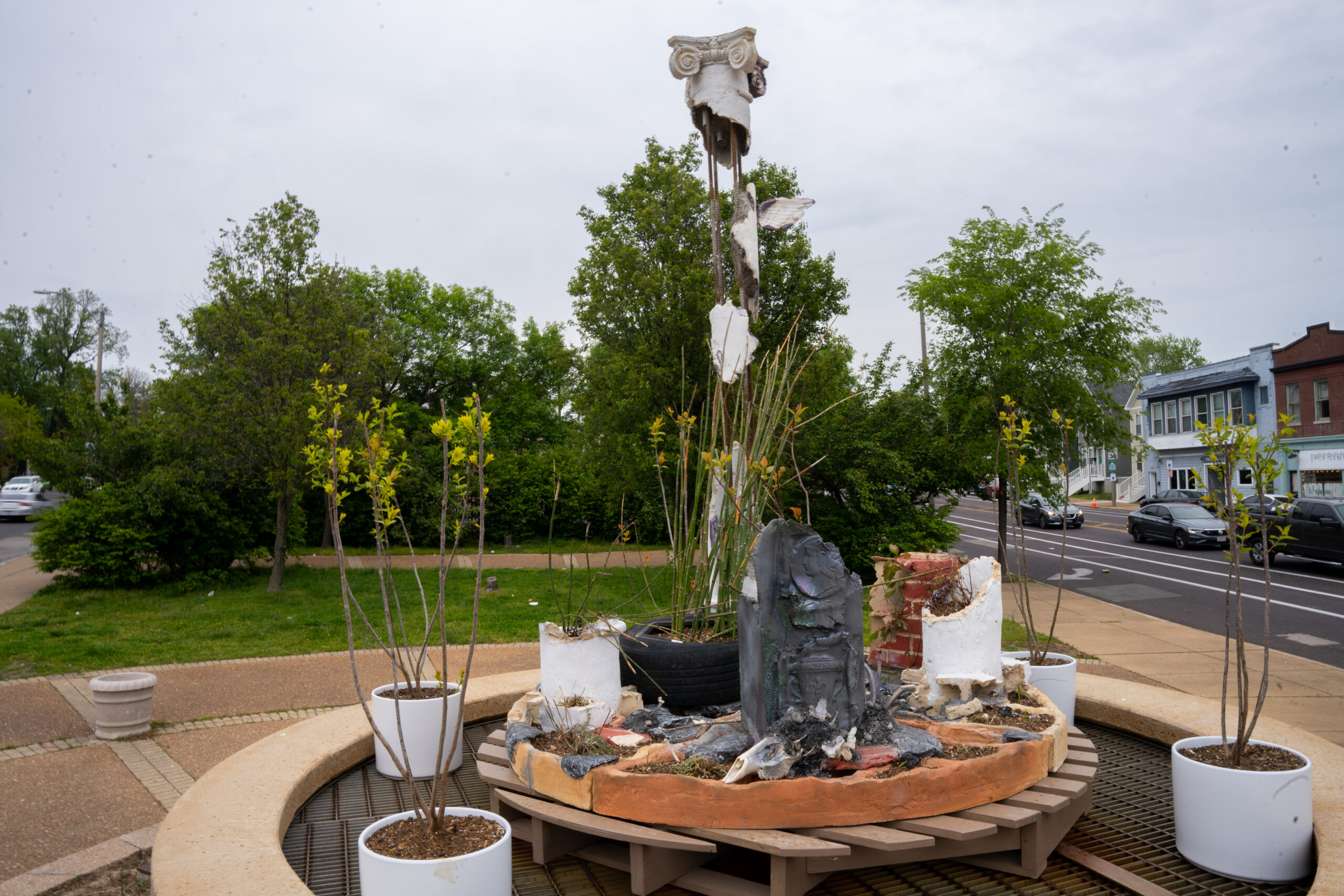 While some parts of this “three-dimensional collage” are in direct reference to the surrounding neighborhood, some are so commonplace that they could be from anywhere in the United States. The columns themselves reference the Neoclassical Revival, a ubiquitous imperialist architectural trend, and is heavily influenced by the idea of the facade—how something can be presented as one thing but be completely different or even empty on the inside. In this sense, Three Columns itself is made to seem contrived, like much of the so-called history that is presented to us as fact rather than fiction.