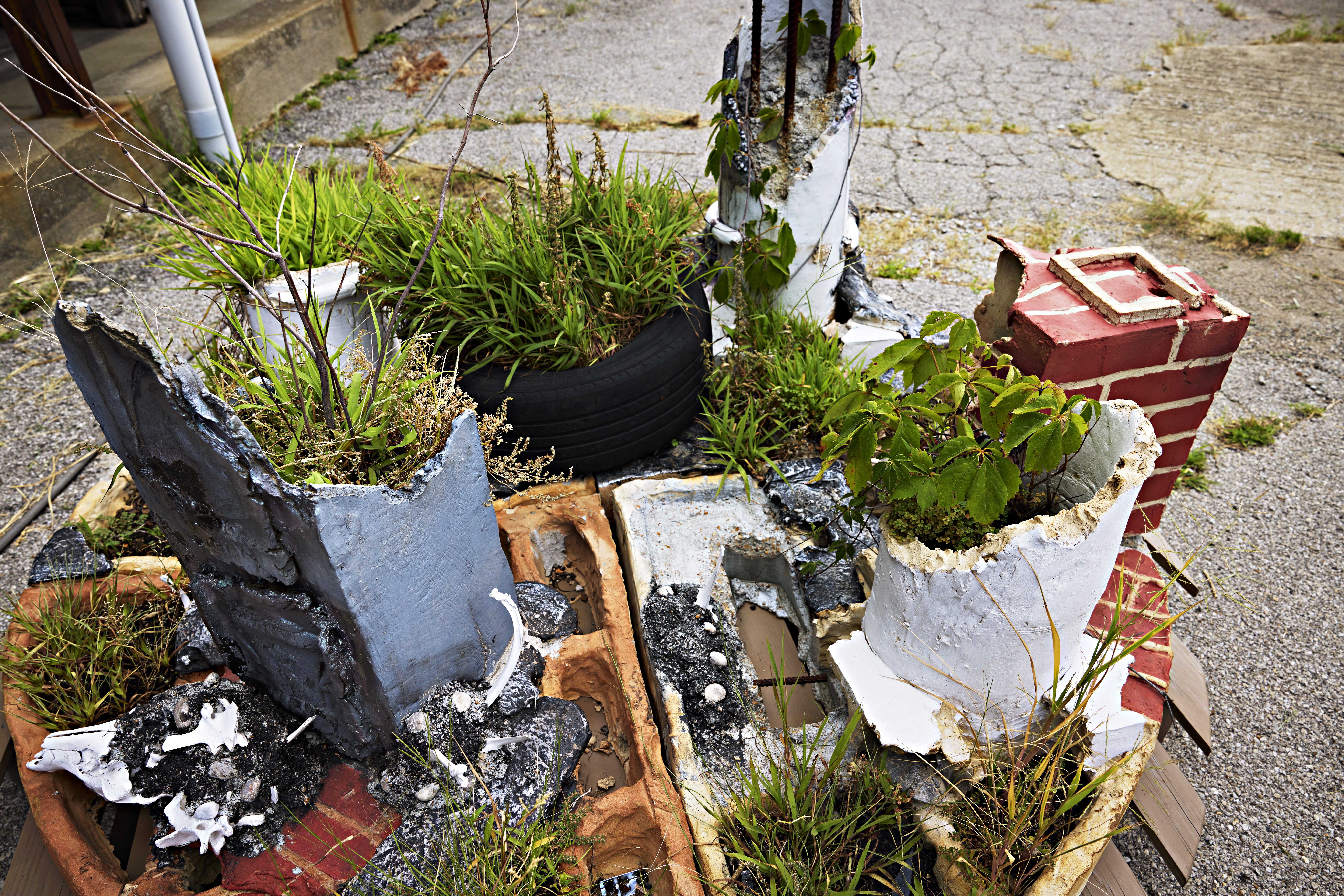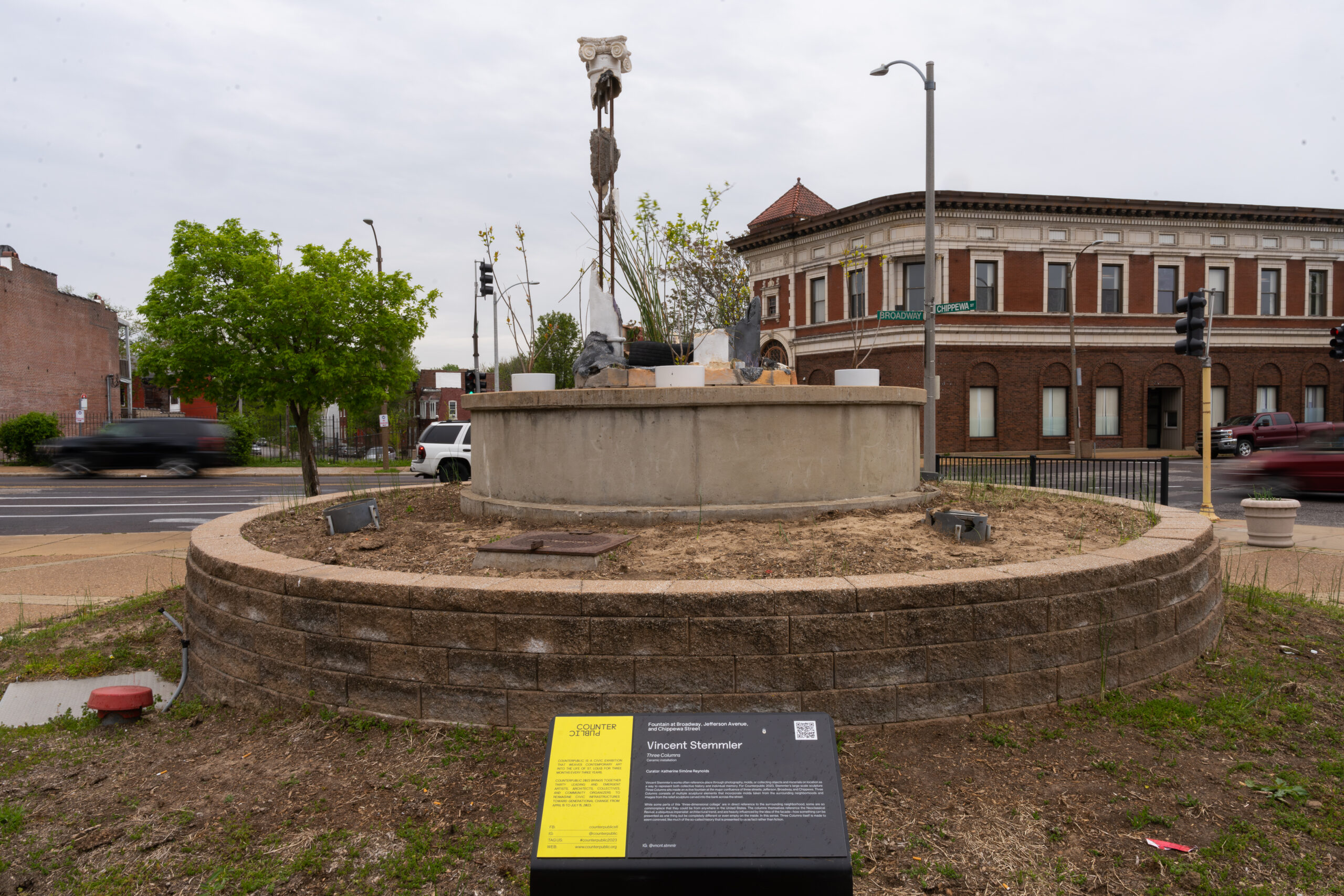 Vincent Stemmler’s works often reference place through photography, molds, or collecting objects and materials on location as a way to represent both collective history and individual memory. For Counterpublic 2023, Stemmler’s large-scale sculpture Three Columns sat inside an active fountain at the major confluence of three streets: Jefferson, Broadway, and Chippewa. Three Columns consists of multiple sculptural elements that incorporate molds taken from the surrounding neighborhoods and images from the relief sculpture carved into the bank across the street.